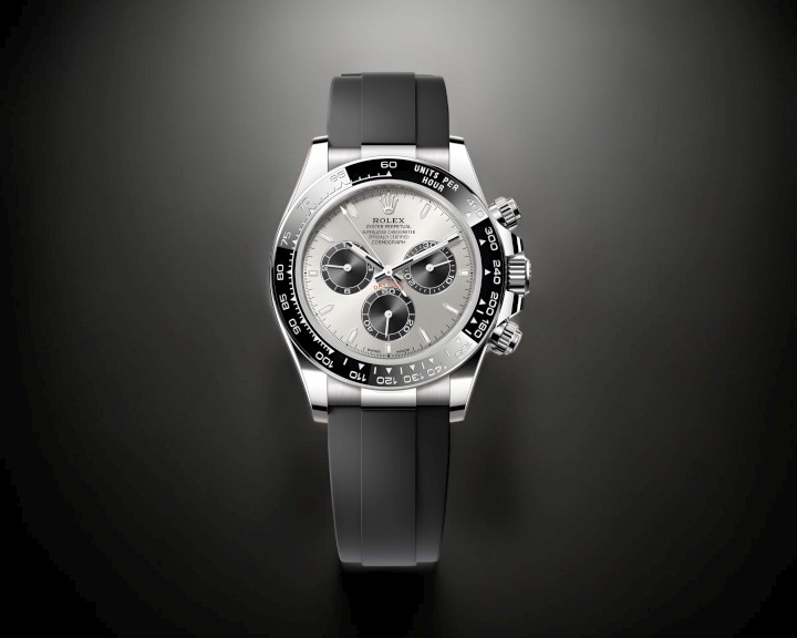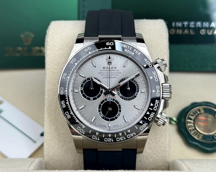 錶殼及摺疊帶扣皆為 白金 材質 / 夜光指針 / 勞力士專利OYSTERFLEX橡膠錶帶 / 灰色面盤 / 迪通拿賽車計時功能 / 藍寶石水晶玻璃鏡面