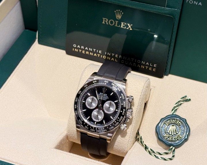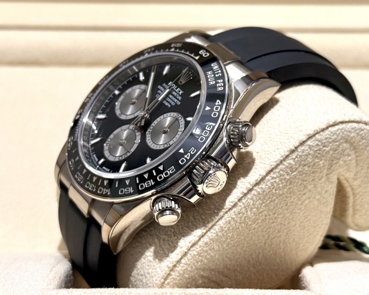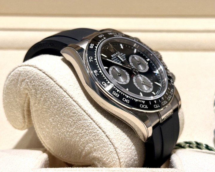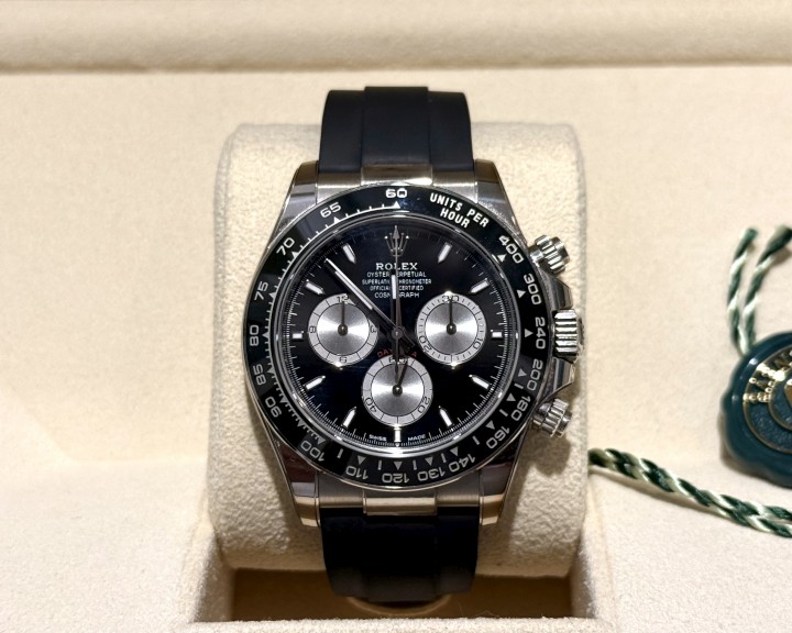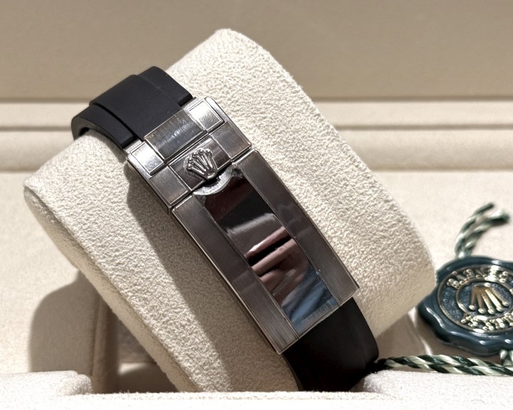 錶殼及摺疊帶扣皆為 白金 材質 / 夜光指針 / 勞力士專利OYSTERFLEX橡膠錶帶 / 黑色面盤 / 迪通拿賽車計時功能 / 藍寶石水晶玻璃鏡面